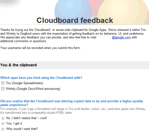 An internal feedback form (update: Google disabled the form) describes Cloudboard as a "server-side clipboard for Google Apps". Google provides an example of copying data from Google Spreadsheets to Google Docs: "if you copy a formatted cell range in Trix (cell border, colors, etc.) and then paste into Writely, it's transformed into a comparably-styled HTML table."